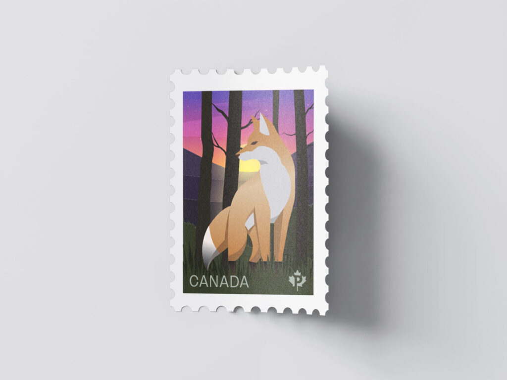 I began by researching endangered Canadian species and gathering visual references. From there, I developed simplified, geometric illustrations and selected color palettes that reflect each animal’s natural environment. The compositions were designed to fit the constraints of a postage stamp while still feeling detailed and expressive.